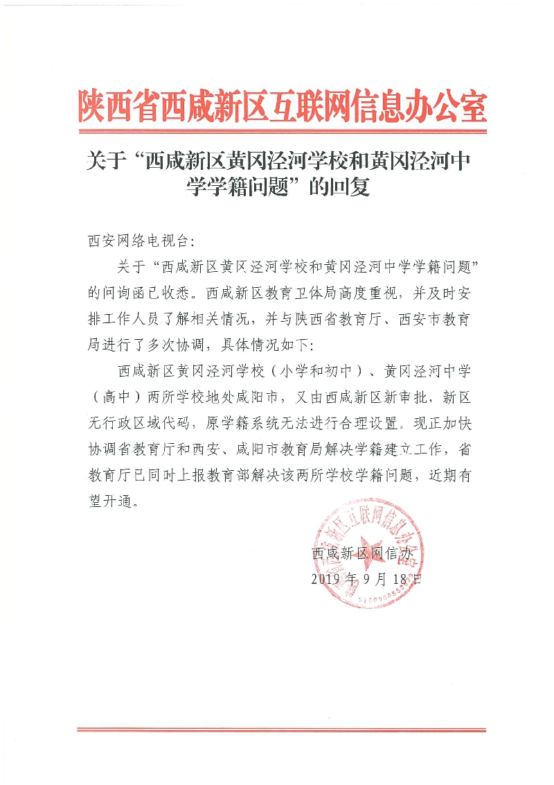 西安网讯 网民在西安网“网民建言”版块留言说:西咸新区黄冈泾河学校从2018年9月开始至今一年时间了,一拖再拖,仍未对全部初中入学学生办理学籍,恳请西安市教育局和西咸新区教体局领导给予高度重视,不能让孩子缺失应有的学籍!!!希望教育部门能给予及时准确的回应!!!